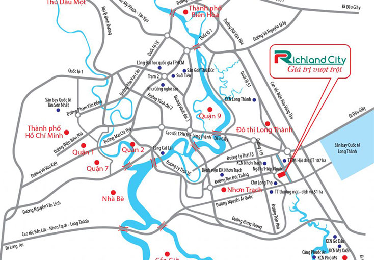 Ngoài ra, trong thời gian tới còn có thêm tuyến đường sắt cao tốc Bắc – Nam, đường sắt trên cao Thủ Thiêm – sân bay quốc tế Long Thành, đường cao tốc Biên Hòa – Vũng Tàu, cầu nối quận 2 và quận 9 với thành phố Nhơn Trạch,… Đặc biệt, khi sân bay quốc tế Long Thành đi vào hoạt động, Richland City sẽ trở thành một đô thị trung tâm sầm uất với đầy đủ các tiện ích đẳng cấp về thương mại, dịch vụ, du lịch sinh thái.